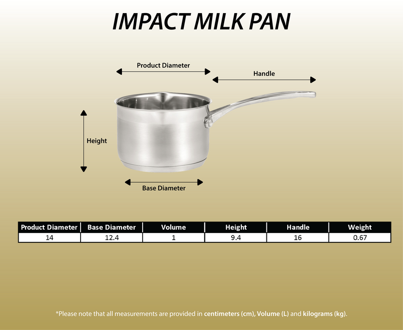 The Milk pan has a stylish two-tone, matte polished appearance. Its optimal 6.4mm thick bonded sandwich base ensures excellent heat distribution.