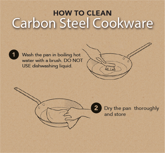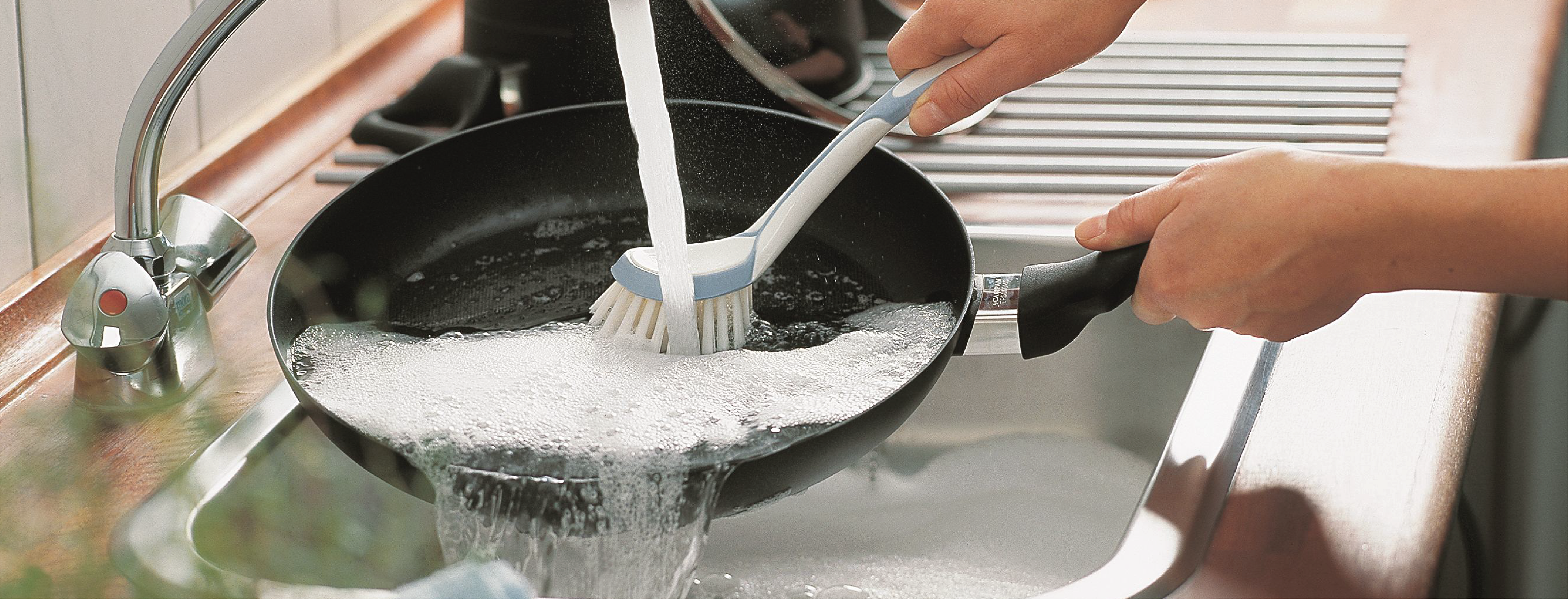 - Wash in hot soapy water with a scouring pad or nylon brush.